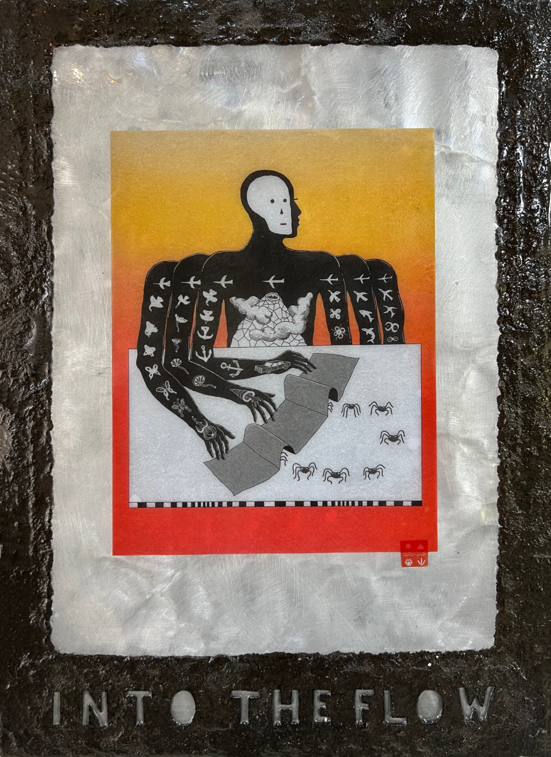 Hand-cut riso print on paper, mounted on aluminium plateon plywood framed with recyled card boardpapier mache, sealed with anti UV Resin 58.5 cm x 42 cm 2025